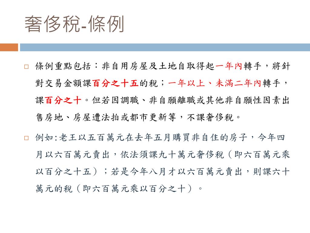 奢侈稅-條例 • 條例重點包括:非自用房屋及土地自取得起一年內轉手,將針對交易金額課百分之十五的稅;一年以上、未滿二年內轉手,課百分之十。但若因調職、非自願離職或其他非自願性因素出售房地、房屋遭法拍或都市更新等,不課奢侈稅。 • 例如:老王以五百萬元在去年五月購買非自住的房子,今年四月以六百萬元賣出,依法須課九十萬元奢侈稅(即六百萬元乘以百分之十五);若是今年八月才以六百萬元賣出,則課六十萬元的稅(即六百萬元乘以百分之十)。