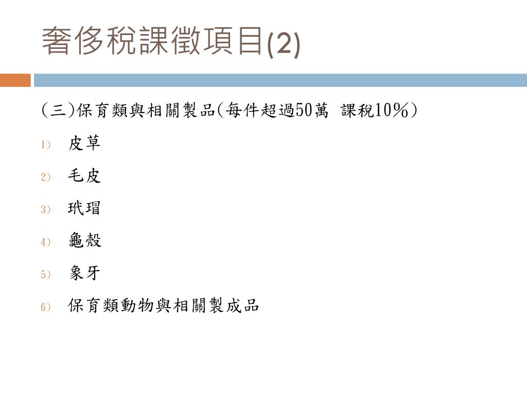 奢侈稅課徵項目(2) (三)保育類與相關製品(每件超過50萬 課稅10%) • 皮草 • 毛皮 • 玳瑁 • 龜殼 • 象牙 • 保育類動物與相關製成品