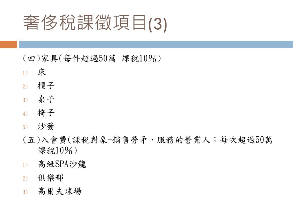 奢侈稅課徵項目(3) (四)家具(每件超過50萬 課稅10%) • 床 • 櫃子 • 桌子 • 椅子 • 沙發 (五)入會費(課稅對象-銷售勞矛、服務的營業人;每次超過50萬 課稅10%) • 高級SPA沙龍 • 俱樂部 • 高爾夫球場