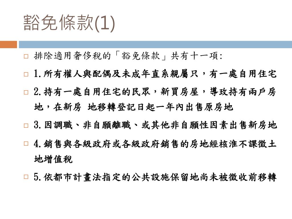 豁免條款(1) • 排除適用奢侈稅的「豁免條款」共有十一項: • 1.所有權人與配偶及未成年直系親屬只,有一處自用住宅 • 2.持有一處自用住宅的民眾,新買房屋,導玫持有兩戶房地,在新房地移轉登記日起一年內出售原房地 • 3.因調職、非自願離職、或其他非自願性因素出售新房地 • 4.銷售與各級政府或各級政府銷售的房地經核淮不課徵土地增值稅 • 5.依都市計畫法指定的公共設施保留地尚未被徵收前移轉