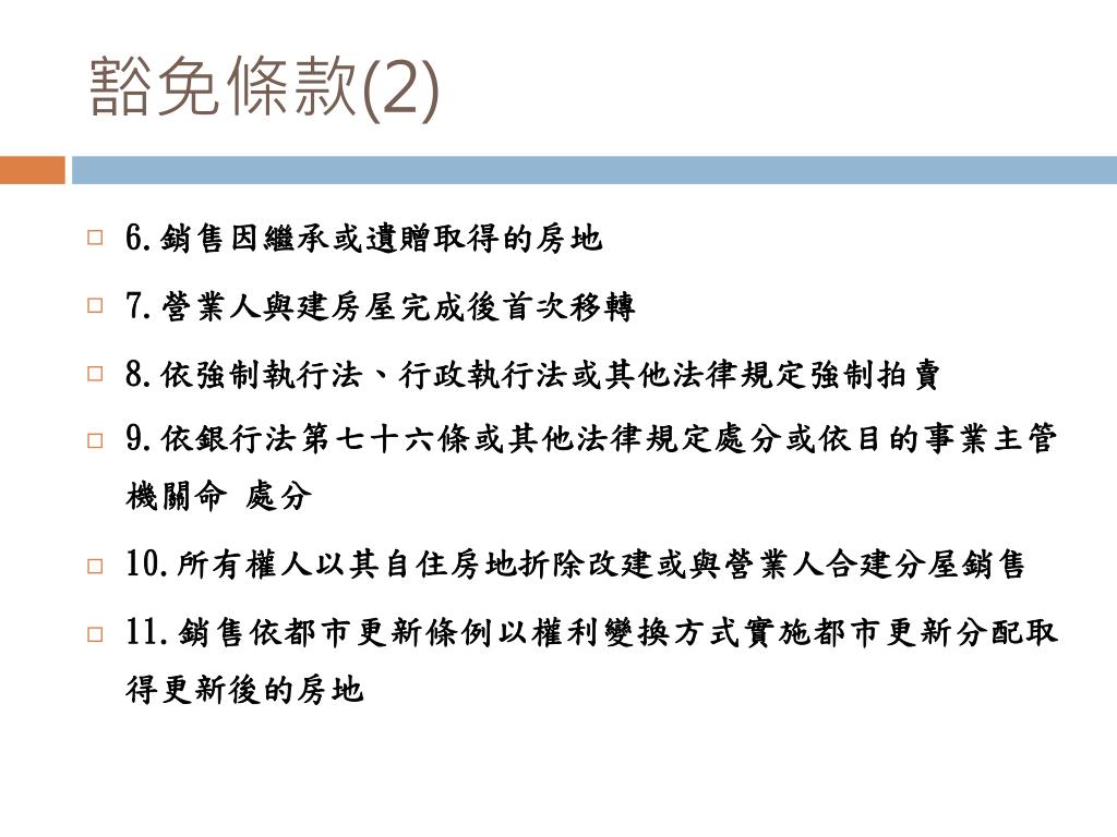豁免條款(2) • 6.銷售因繼承或遺贈取得的房地 • 7.營業人與建房屋完成後首次移轉 • 8.依強制執行法、行政執行法或其他法律規定強制拍賣 • 9.依銀行法第七十六條或其他法律規定處分或依目的事業主管機關命 處分 • 10.所有權人以其自住房地折除改建或與營業人合建分屋銷售 • 11.銷售依都市更新條例以權利變換方式實施都市更新分配取得更新後的房地