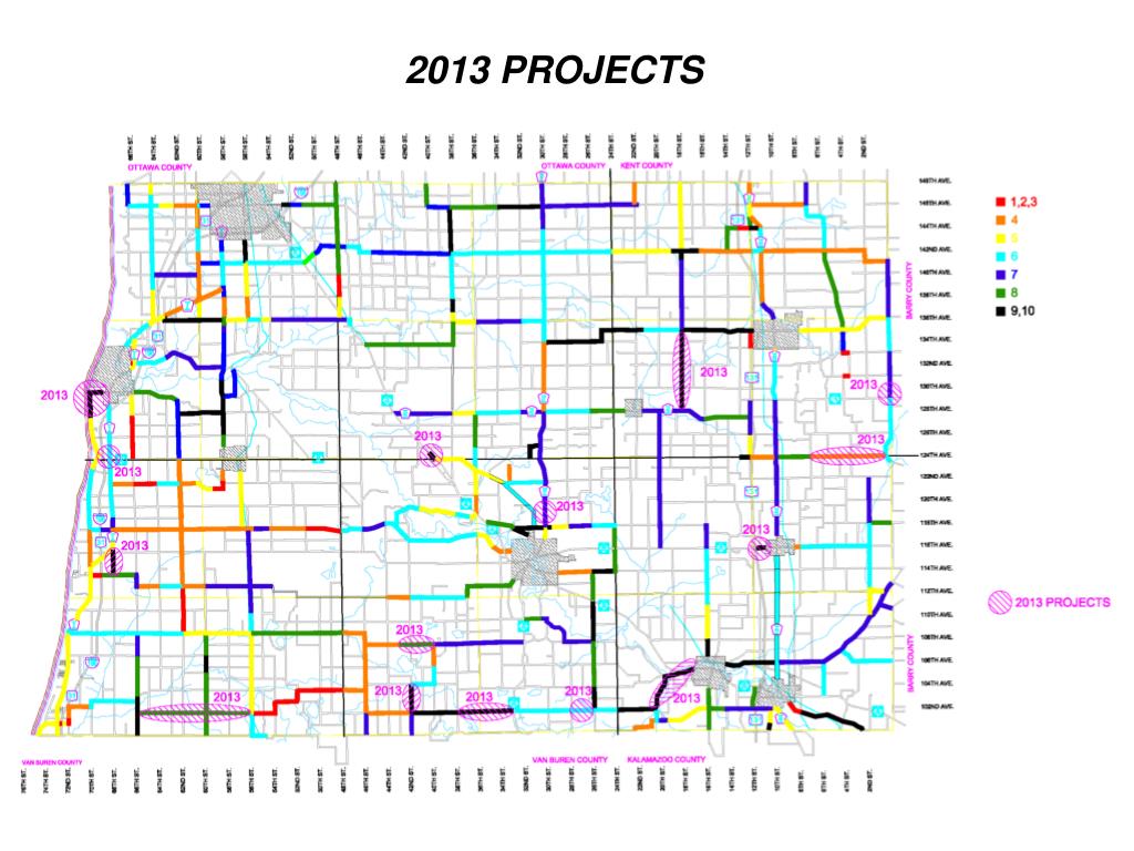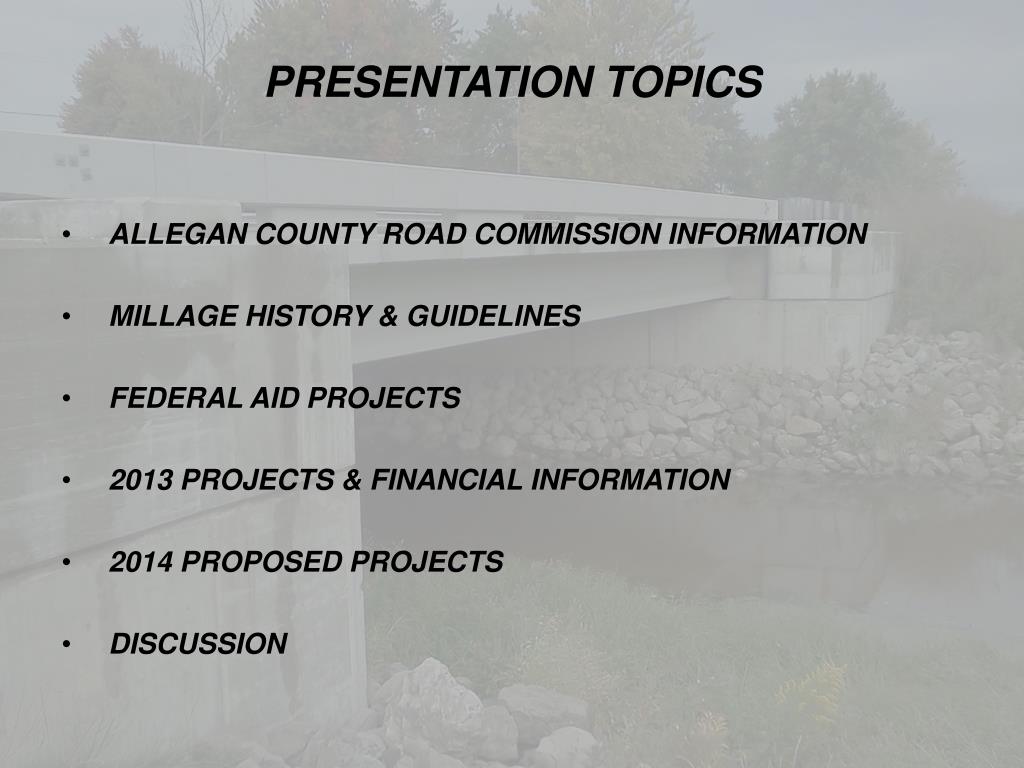 PRESENTATION TOPICS • ALLEGAN COUNTY ROAD COMMISSION INFORMATION • MILLAGE HISTORY & GUIDELINES • FEDERAL AID PROJECTS • 2013 PROJECTS & FINANCIAL INFORMATION • 2014 PROPOSED PROJECTS • DISCUSSION