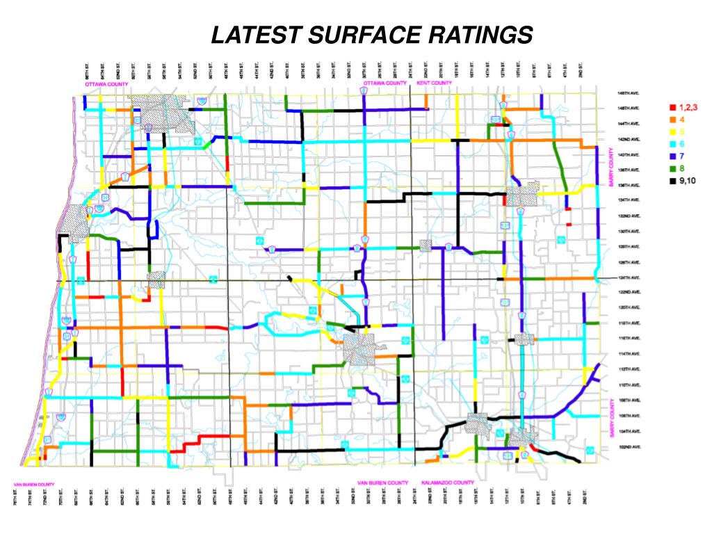 ALLEGAN COUNTY ROADS & BRIDGES • The Allegan County Road Commission is responsible for 1,797 miles of roadway and 148 bridges • 512 Primary Miles • 478 miles paved (3 new miles in 2014) • 34 miles gravel • 1285 Local Miles • 634 miles paved (4.25 new miles in 2013) • 651 miles gravel (67 miles seasonal, not snow plowed) • 148 Bridges • 49 Primary System • 99 Local System • To be classified as a bridge the structure must have a minimum span of 20’ and can be a combination of culverts.