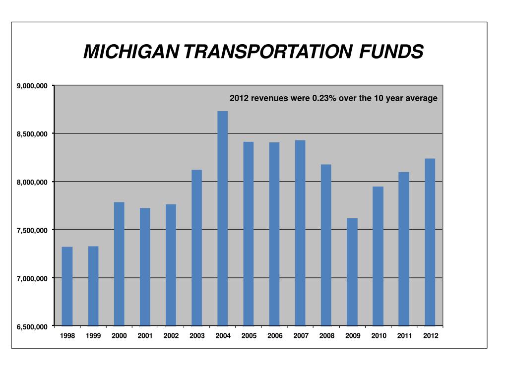 ROAD COMMISSION / LOCAL REVENUES The Road Commission receives revenue through the Michigan Transportation Fund (MTF) from fuel tax and vehicle registrations. This revenue is used to pay for operating and maintenance costs of the roads in Allegan County including payroll, utility costs, equipment and materials, etc.. MTF rates average $2,257.84 per mile of local road and $9,520.72 per mile of primary road. In 2012 the Road Commission’s MTF revenue was $8,233,772. Federal and State funding acquired for roads and bridges totaled $2,639,616. The Primary Millage raised $3,104,628 and township contributions added an additional $6,164,277 for primary roads (paved shoulders) and for preventative maintenance and improvements to the local road system. In 2012, locally raised revenues in Allegan County totaled $9,268,905 and were higher than any other road commission in the state.