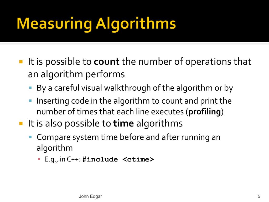 Measuring Algorithms • It is possible to count the number of operations that an algorithm performs • By a careful visual walkthrough of the algorithm or by • Inserting code in the algorithm to count and print the number of times that each line executes (profiling) • It is also possible to time algorithms • Compare system time before and after running an algorithm • E.g., in C++: #include <ctime> John Edgar