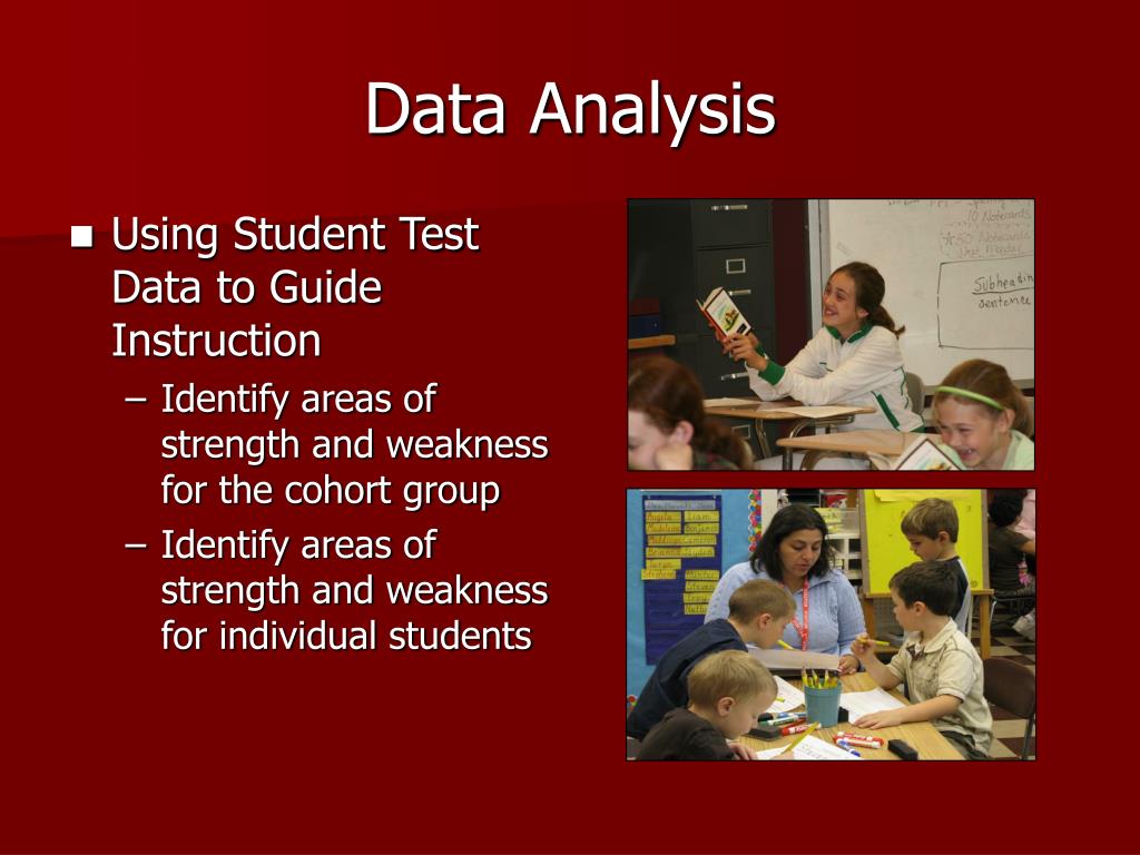 Data Analysis • Using Student Test Data to Guide Instruction • Identify areas of strength and weakness for the cohort group • Identify areas of strength and weakness for individual students