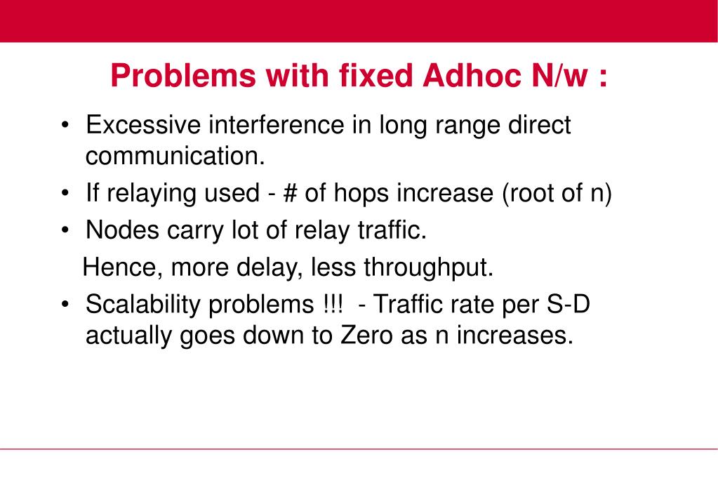 Problems with fixed Adhoc N/w : • Excessive interference in long range direct communication. • If relaying used - # of hops increase (root of n) • Nodes carry lot of relay traffic. Hence, more delay, less throughput. • Scalability problems !!! - Traffic rate per S-D actually goes down to Zero as n increases.