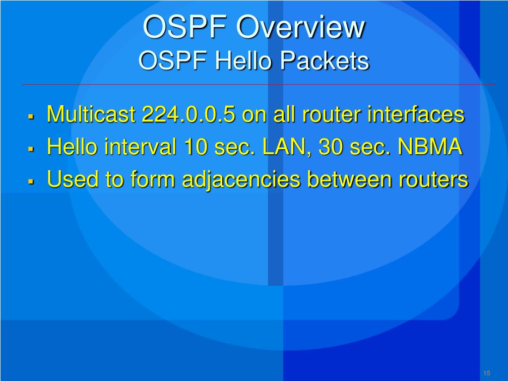 OSPF Overview OSPF Hello Packets • Multicast 224.0.0.5 on all router interfaces • Hello interval 10 sec. LAN, 30 sec. NBMA • Used to form adjacencies between routers