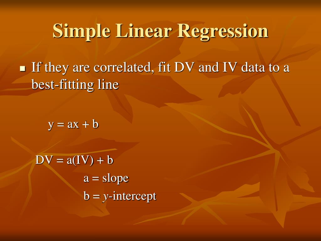 Simple Linear Regression • If they are correlated, fit DV and IV data to a best-fitting line y = ax + b DV = a(IV) + b a = slope b = y-intercept