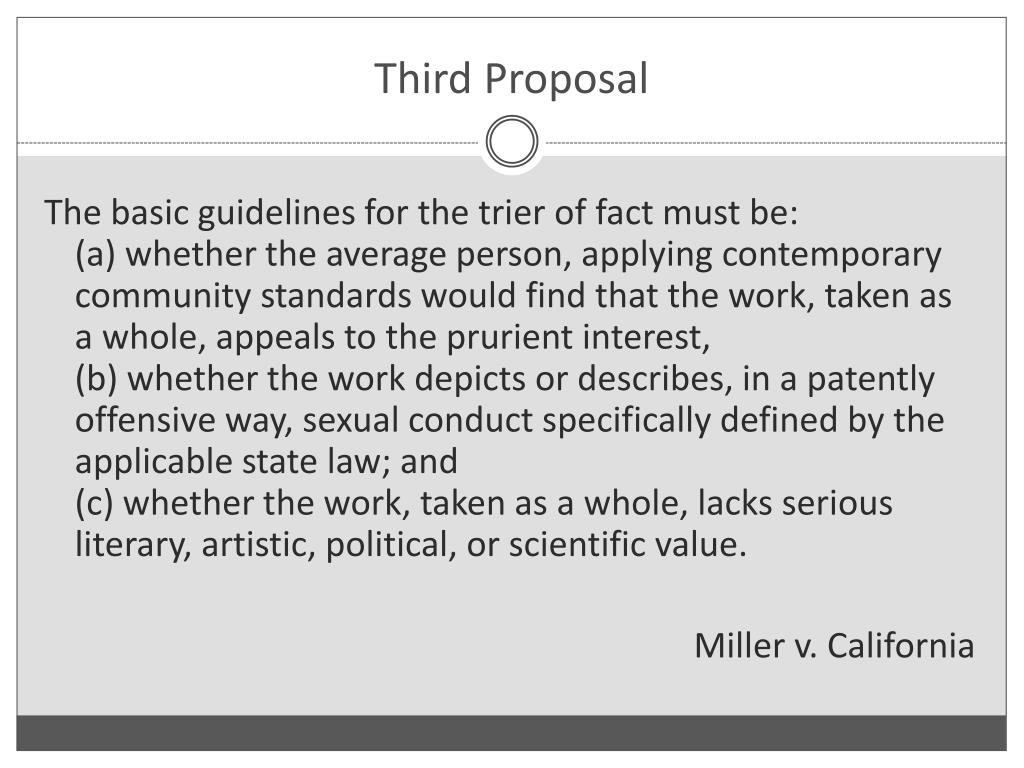 Third Proposal The basic guidelines for the trier of fact must be:(a) whether the average person, applying contemporary community standards would find that the work, taken as a whole, appeals to the prurient interest, (b) whether the work depicts or describes, in a patently offensive way, sexual conduct specifically defined by the applicable state law; and(c) whether the work, taken as a whole, lacks serious literary, artistic, political, or scientific value. Miller v. California