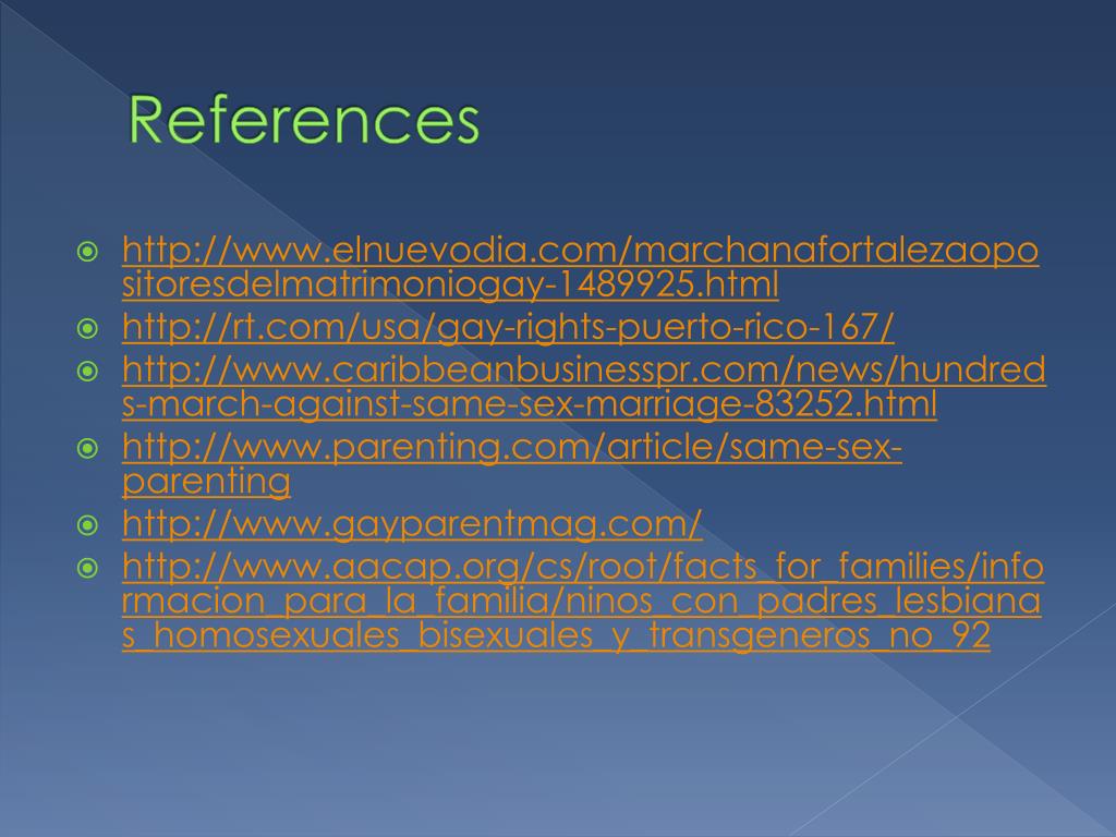 References • http://www.elnuevodia.com/marchanafortalezaopositoresdelmatrimoniogay-1489925.html • http://rt.com/usa/gay-rights-puerto-rico-167/ • http://www.caribbeanbusinesspr.com/news/hundreds-march-against-same-sex-marriage-83252.html • http://www.parenting.com/article/same-sex-parenting • http://www.gayparentmag.com/ • http://www.aacap.org/cs/root/facts_for_families/informacion_para_la_familia/ninos_con_padres_lesbianas_homosexuales_bisexuales_y_transgeneros_no_92