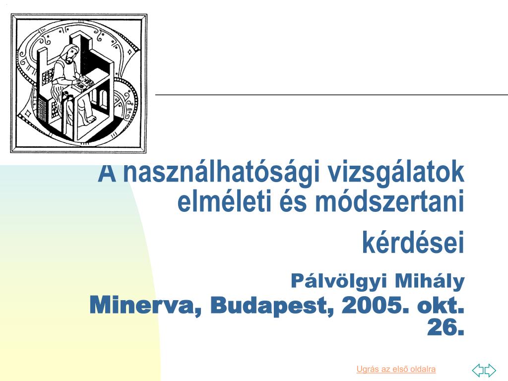 A használhatósági vizsgálatok elméleti és módszertani kérdéseiPálvölgyi MihályMinerva, Budapest, 2005. okt. 26.