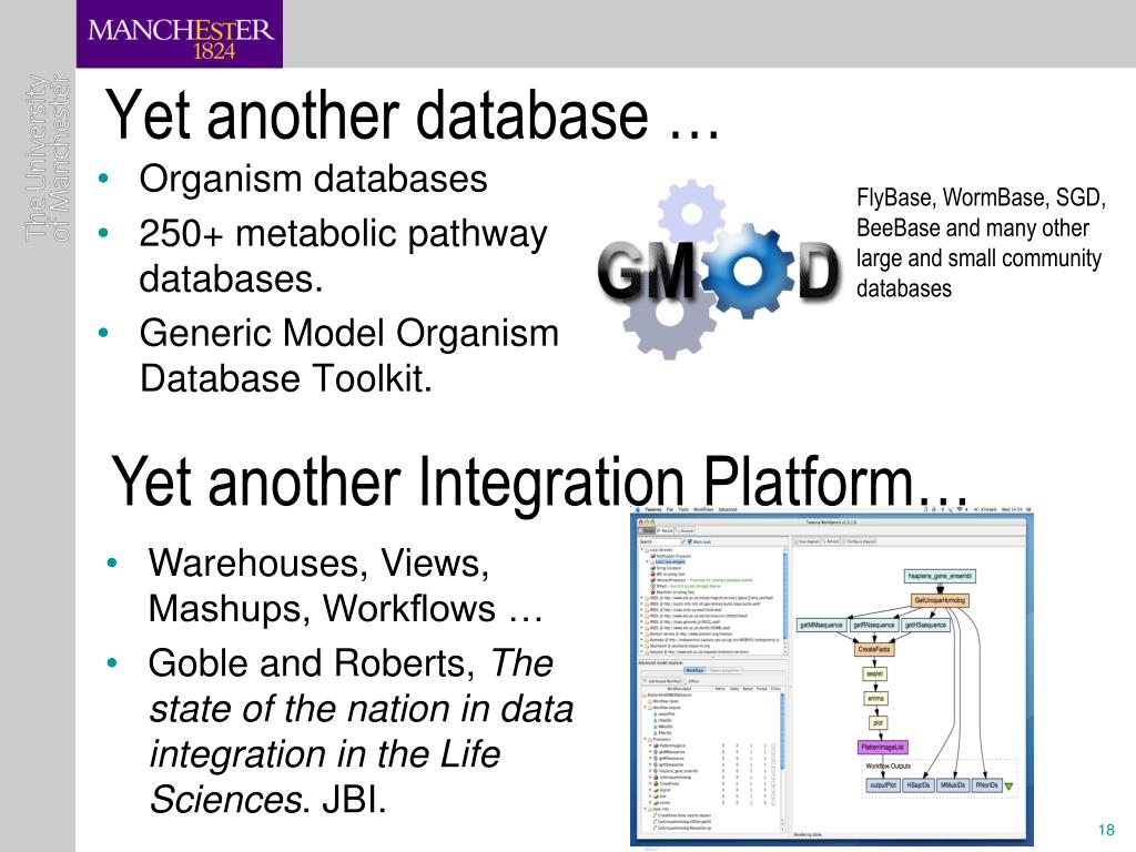 Yet another database … FlyBase, WormBase, SGD, BeeBase and many other large and small community databases • Organism databases • 250+ metabolic pathway databases. • Generic Model Organism Database Toolkit. Yet another Integration Platform… • Warehouses, Views, Mashups, Workflows … • Goble and Roberts, The state of the nation in data integration in the Life Sciences. JBI. 18