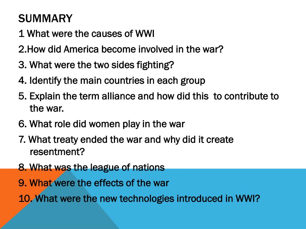 Summary • 1 What were the causes of WWI • 2.How did America become involved in the war? • 3. What were the two sides fighting? • 4. Identify the main countries in each group • 5. Explain the term alliance and how did this to contribute to the war. • 6. What role did women play in the war • 7. What treaty ended the war and why did it create resentment? • 8. What was the league of nations • 9. What were the effects of the war • 10. What were the new technologies introduced in WWI?