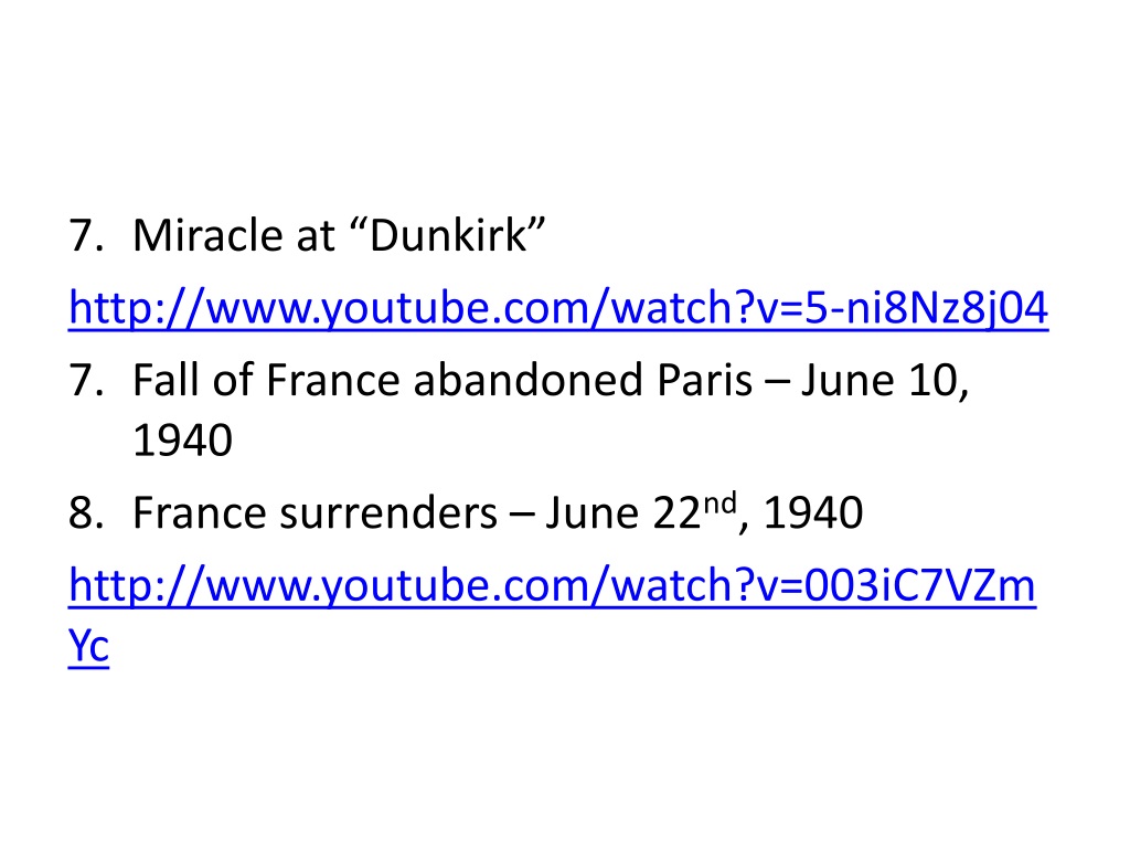 Miracle at “Dunkirk” http://www.youtube.com/watch?v=5-ni8Nz8j04 • Fall of France abandoned Paris – June 10, 1940 • France surrenders – June 22nd, 1940 http://www.youtube.com/watch?v=003iC7VZmYc