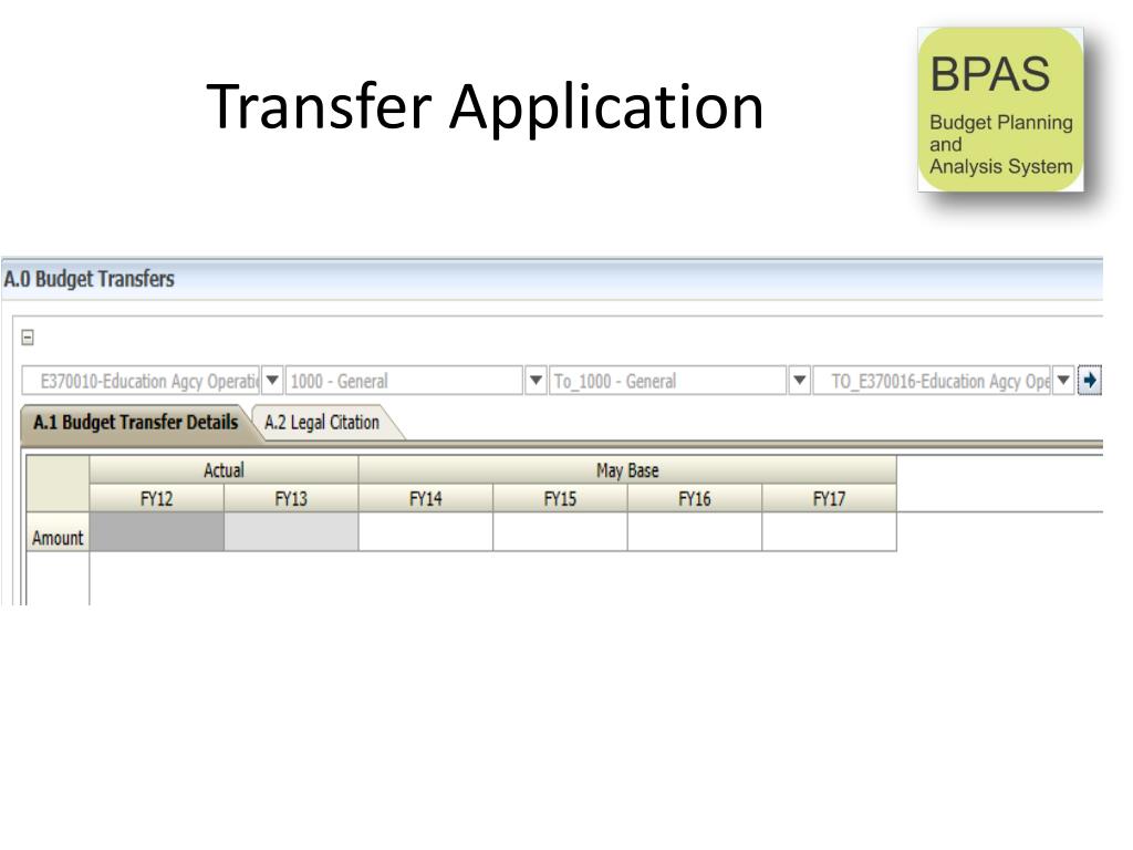 BPAS Phase I Improvements • Reporting: Simplify report options and organization to limit user selection and increase confidence in data selected. Go Live August 2014 • Transfers: rebuilt the application to eliminate double counting of transfers in fiscal pages and simplify reporting. Completed • Change Items: rebuilt the application to enhance usability and reporting capabilities. Completed