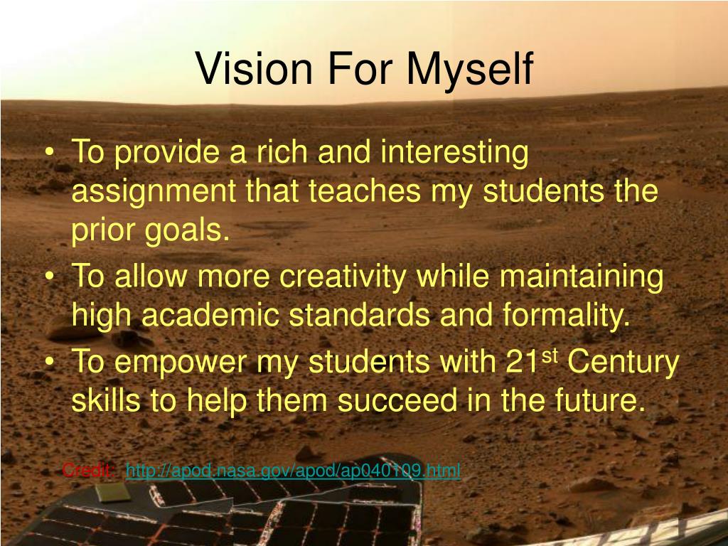 Vision For Myself • To provide a rich and interesting assignment that teaches my students the prior goals. • To allow more creativity while maintaining high academic standards and formality. • To empower my students with 21st Century skills to help them succeed in the future. Credit:http://apod.nasa.gov/apod/ap040109.html