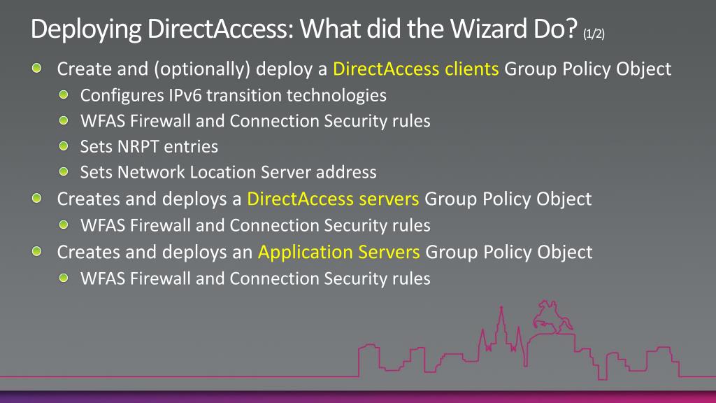 Deploying DirectAccess: What did the Wizard Do? (1/2) • Create and (optionally) deploy a DirectAccess clients Group Policy Object • Configures IPv6 transition technologies • WFAS Firewall and Connection Security rules • Sets NRPT entries • Sets Network Location Server address • Creates and deploys a DirectAccess servers Group Policy Object • WFAS Firewall and Connection Security rules • Creates and deploys an Application Servers Group Policy Object • WFAS Firewall and Connection Security rules
