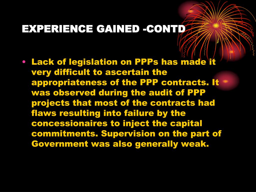 EXPERIENCE GAINED -CONTD • Lack of legislation on PPPs has made it very difficult to ascertain the appropriateness of the PPP contracts. It was observed during the audit of PPP projects that most of the contracts had flaws resulting into failure by the concessionaires to inject the capital commitments. Supervision on the part of Government was also generally weak.