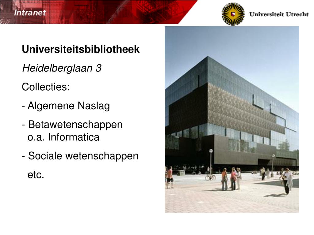 Universiteitsbibliotheek • Heidelberglaan 3 • Collecties: • Algemene Naslag • Betawetenschappen o.a. Informatica • Sociale wetenschappen • etc.