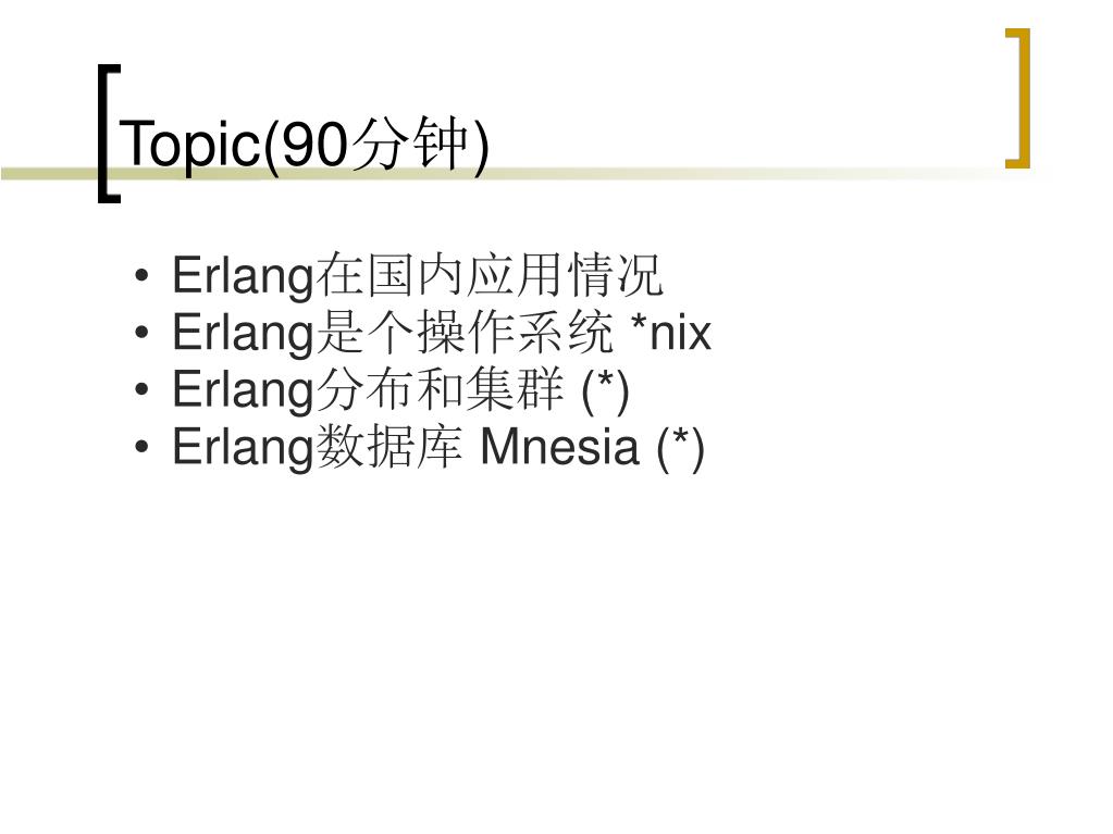 Topic(90分钟) Erlang在国内应用情况 Erlang是个操作系统 *nix Erlang分布和集群 (*) Erlang数据库 Mnesia (*)