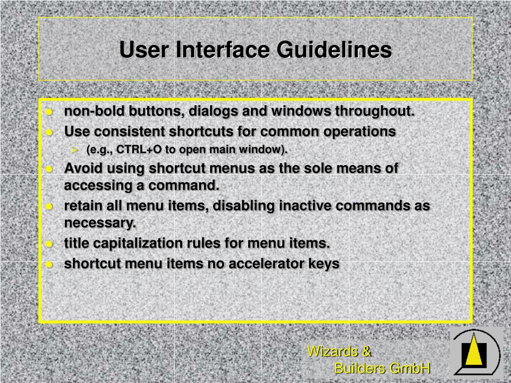 User Interface Guidelines • non-bold buttons, dialogs and windows throughout. • Use consistent shortcuts for common operations • (e.g., CTRL+O to open main window). • Avoid using shortcut menus as the sole means of accessing a command. • retain all menu items, disabling inactive commands as necessary. • title capitalization rules for menu items. • shortcut menu items no accelerator keys