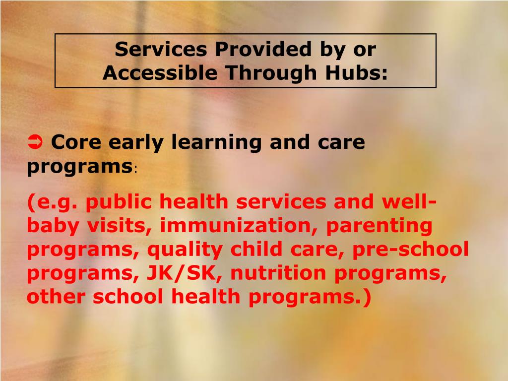 Services Provided by orAccessible Through Hubs: Core early learning and care programs: (e.g. public health services and well-baby visits, immunization, parenting programs, quality child care, pre-school programs, JK/SK, nutrition programs, other school health programs.)