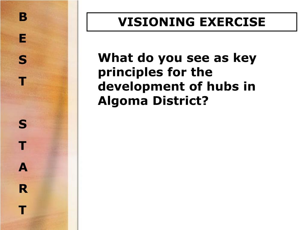B E S T S T A R T VISIONING EXERCISE What do you see as key principles for the development of hubs in Algoma District?