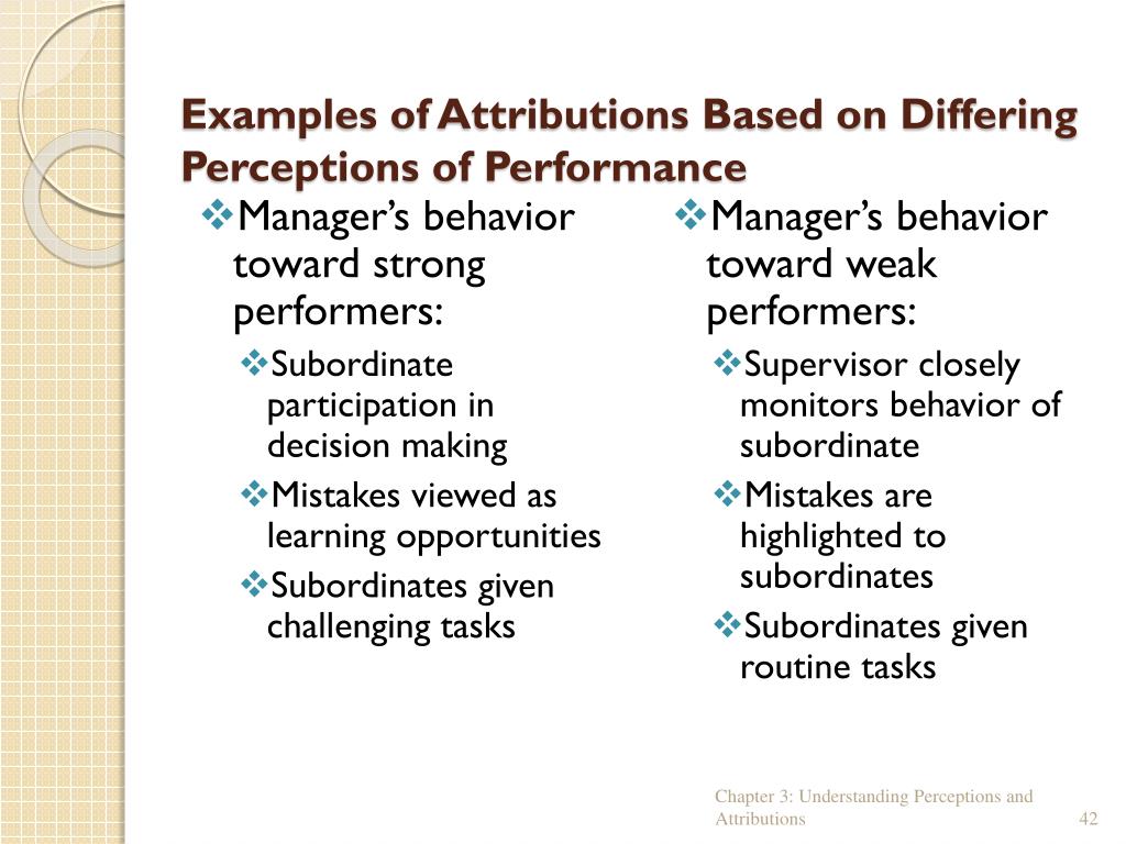 Examples of Attributions Based on Differing Perceptions of Performance • Manager’s behavior toward strong performers: • Subordinate participation in decision making • Mistakes viewed as learning opportunities • Subordinates given challenging tasks • Manager’s behavior toward weak performers: • Supervisor closely monitors behavior of subordinate • Mistakes are highlighted to subordinates • Subordinates given routine tasks Chapter 3: Understanding Perceptions and Attributions