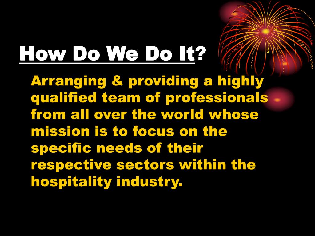 How Do We Do It? Arranging & providing a highly qualified team of professionals from all over the world whose mission is to focus on the specific needs of their respective sectors within the hospitality industry.