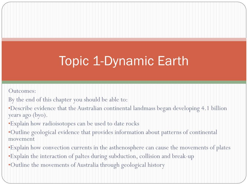 Topic 1-Dynamic Earth Outcomes: By the end of this chapter you should be able to: Describe evidence that the Australian continental landmass began developing 4.1 billion years ago (byo). Explain how radioisotopes can be used to date rocks Outline geological evidence that provides information about patterns of continental movement Explain how convection currents in the asthenosphere can cause the movements of plates Explain the interaction of paltes during subduction, collision and break-up Outline the movements of Australia through geological history