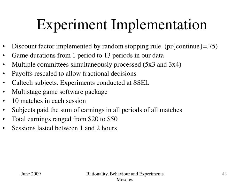 Experiment Implementation • Discount factor implemented by random stopping rule. (pr{continue}=.75) • Game durations from 1 period to 13 periods in our data • Multiple committees simultaneously processed (5x3 and 3x4) • Payoffs rescaled to allow fractional decisions • Caltech subjects. Experiments conducted at SSEL • Multistage game software package • 10 matches in each session • Subjects paid the sum of earnings in all periods of all matches • Total earnings ranged from $20 to $50 • Sessions lasted between 1 and 2 hours Rationality, Behaviour and Experiments Moscow