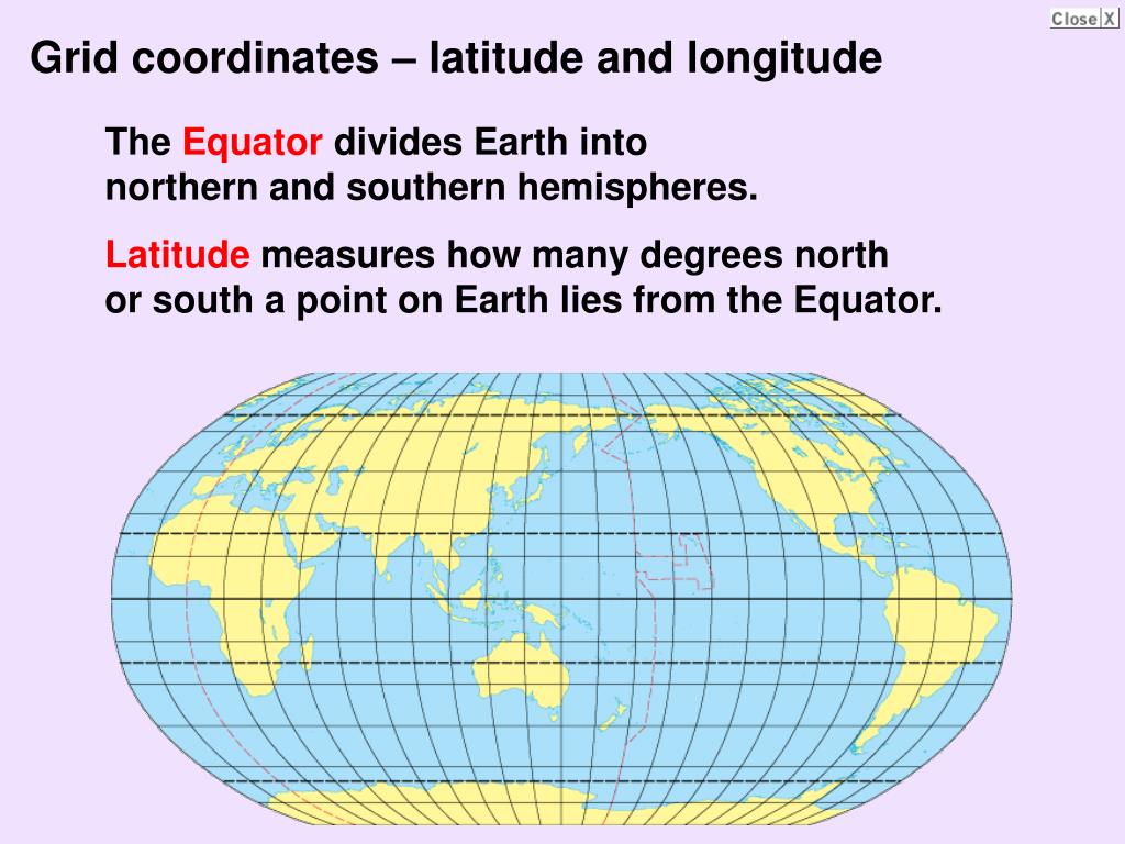 Grid coordinates – latitude and longitude • The Equator divides Earth into northern and southern hemispheres. Latitude measures how many degrees north or south a point on Earth lies from the Equator.