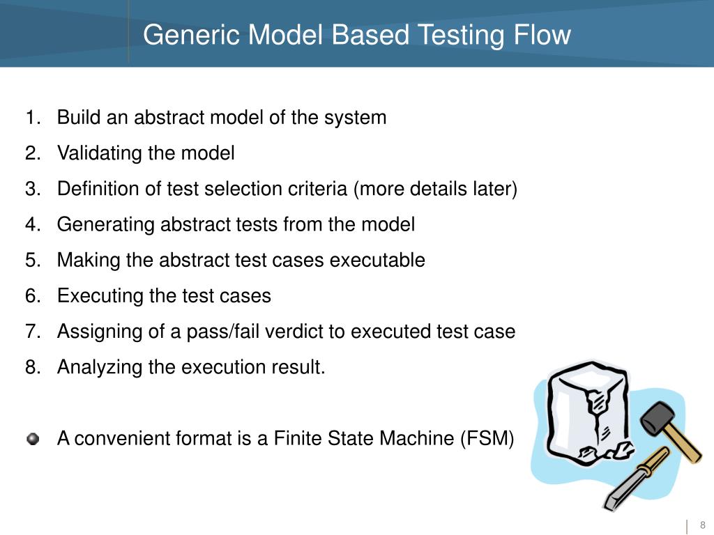 Generic Model Based Testing Flow Build an abstract model of the system Validating the model Definition of test selection criteria (more details later) Generating abstract tests from the model Making the abstract test cases executable Executing the test cases Assigning of a pass/fail verdict to executed test case Analyzing the execution result. A convenient format is a Finite State Machine (FSM) 8