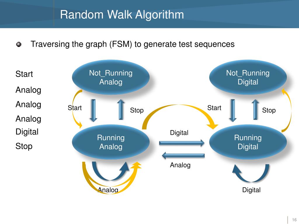 Random Walk Algorithm • Traversing the graph (FSM) to generate test sequences Not_Running Analog Not_Running Digital Start Analog Analog Start Start Stop Stop Analog Running Analog Running Digital Digital Digital Stop Analog Analog Digital