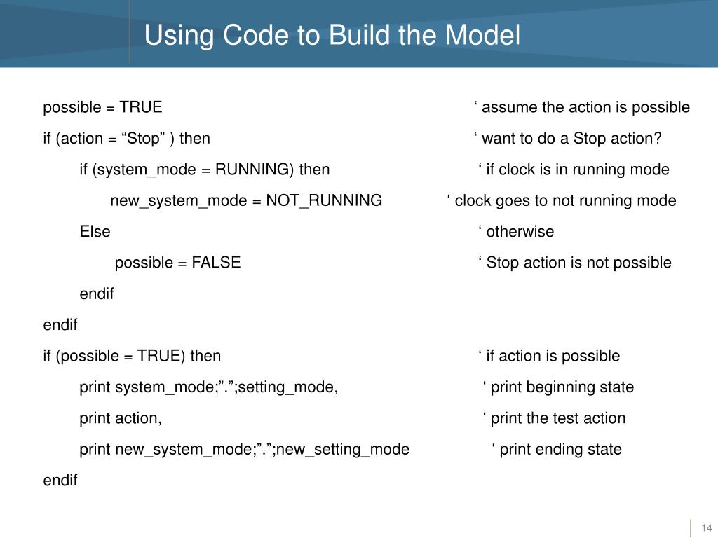 Using Code to Build the Model • possible = TRUE ‘ assume the action is possible • if (action = “Stop” ) then ‘ want to do a Stop action? • if (system_mode = RUNNING) then ‘ if clock is in running mode • new_system_mode = NOT_RUNNING ‘ clock goes to not running mode • Else ‘ otherwise • possible = FALSE ‘ Stop action is not possible • endif • endif • if (possible = TRUE) then ‘ if action is possible • print system_mode;”.”;setting_mode, ‘ print beginning state • print action, ‘ print the test action • print new_system_mode;”.”;new_setting_mode ‘ print ending state • endif