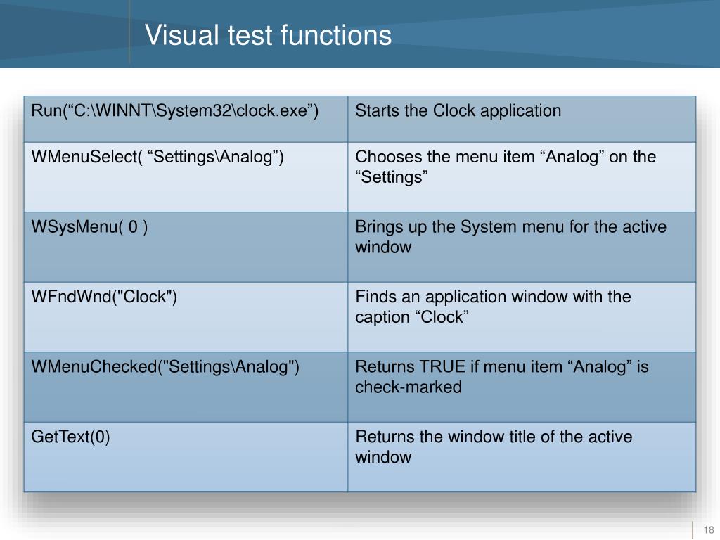 Executing the test actions • open "test_sequence.txt" for input as #infile ‘get the list of test actions • while not (EOF(infile)) • line input #infile, action ‘read in a test action • select case action • case “Start“ ‘ Start the Clock • run("C:\WINNT\System32\clock.exe”) ‘ VT call to start clock • case “Analog“ ‘ choose Analog mode • WMenuSelect("Settings\Analog") ‘ VT call to select Analog • case “Digital“ ‘ choose Digital mode • WMenuSelect("Settings\Digital") ‘ VT call to select Digital • case “Stop“ ‘ Stop the Clock • WSysMenu (0) ‘ VT call to bring up system menu • WMenuSelect ("Close") ‘ VT call to select Close • end select • wend