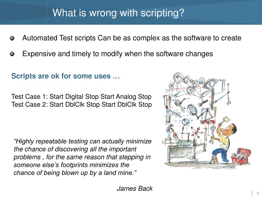 What is wrong with scripting? • Automated Test scripts Can be as complex as the software to create • Expensive and timely to modify when the software changes Scripts are ok for some uses … Test Case 1: Start Digital Stop Start Analog Stop Test Case 2: Start DblClk Stop Start DblClk Stop “Highly repeatable testing can actually minimize the chance of discovering all the important problems , for the same reason that stepping in someone else’s footprints minimizes the chance of being blown up by a land mine.” James Back