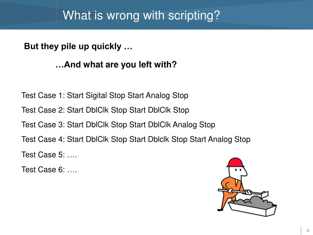 What is wrong with scripting? But they pile up quickly … • Test Case 1: Start Sigital Stop Start Analog Stop • Test Case 2: Start DblClk Stop Start DblClk Stop • Test Case 3: Start DblClk Stop Start DblClk Analog Stop • Test Case 4: Start DblClk Stop Start Dblclk Stop Start Analog Stop • Test Case 5: …. • Test Case 6: …. …And what are you left with?