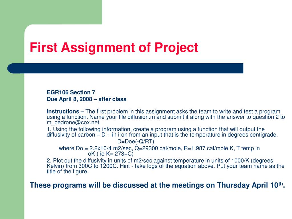 First Assignment of Project EGR106 Section 7 Due April 8, 2008 – after class Instructions – The first problem in this assignment asks the team to write and test a program using a function. Name your file diffusion.m and submit it along with the answer to question 2 to m_cedrone@cox.net. 1. Using the following information, create a program using a function that will output the diffusivity of carbon – D - in iron from an input that is the temperature in degrees centigrade. D=Doe(-Q/RT) where Do = 2.2x10-4 m2/sec, Q=29300 cal/mole, R=1.987 cal/mole.K, T temp in oK ( ie K= 273+C) 2. Plot out the diffusivity in units of m2/sec against temperature in units of 1000/K (degrees Kelvin) from 300C to 1200C. Hint - take logs of the equation above. Put your team name as the title of the figure. These programs will be discussed at the meetings on Thursday April 10th.