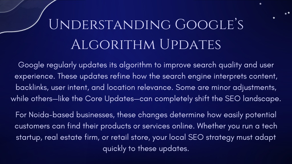 3. Understanding Google’s Algorithm Updates Google regularly updates its algorithm to improve search quality and user experience. These updates refine how the search engine interprets content, backlinks, user intent, and location relevance. Some are minor adjustments, while others—like the Core Updates—can completely shift the SEO landscape. For Noida-based businesses, these changes determine how easily potential customers can find their products or services online. Whether you run a tech startup, real estate firm, or retail store, your local SEO strategy must adapt quickly to these updates.