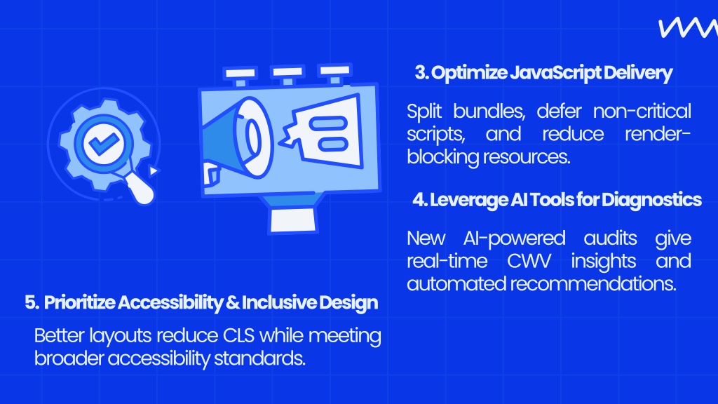 3. Optimize JavaScript Delivery Split bundles, defer non-critical scripts, and reduce render- blocking resources. 4. Leverage AI Tools for Diagnostics New AI-powered audits give real-time CWV insights and automated recommendations. 5. Prioritize Accessibility & Inclusive Design Better layouts reduce CLS while meeting broader accessibility standards.