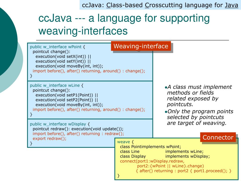 Our approach • A programmer who defines a weaving has only to be aware of weaving-interfaces. • A programmer of the class can change its implementation without being aware of the client if the class conforms to its weaving-interfaces. Component weaving-interface component (class) programmer Connector Component programmer who connects components component (class) programmer