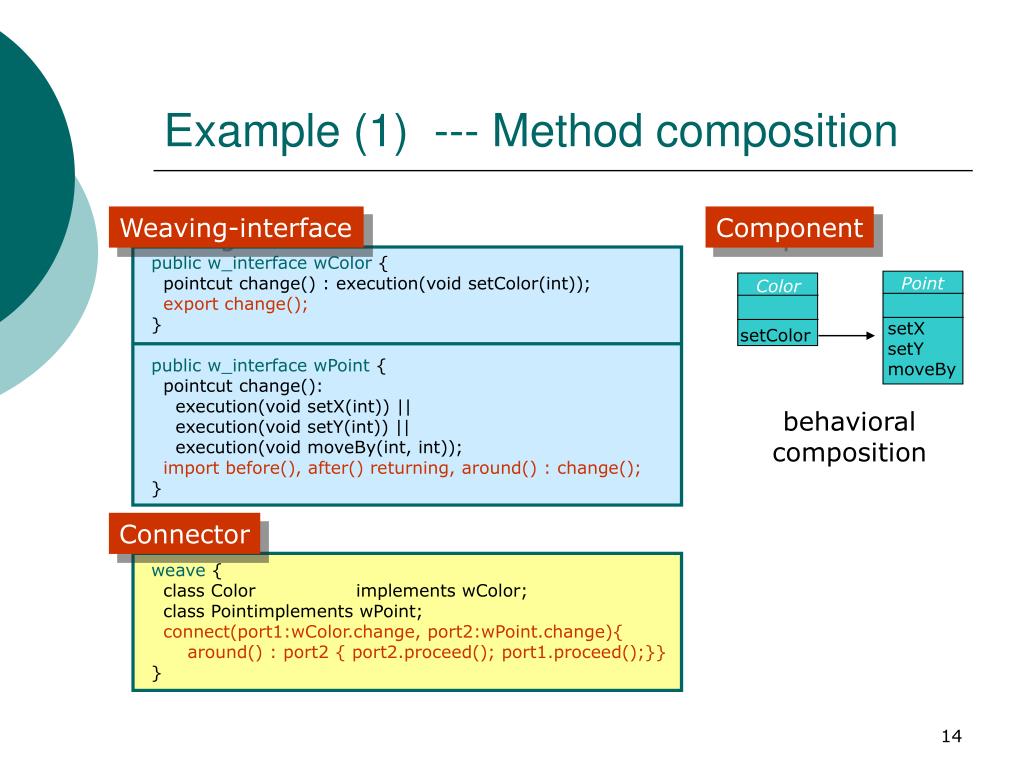 Example (1) --- Method composition Weaving-interface Component public w_interface wColor { pointcut change() : execution(void setColor(int)); export change(); } public w_interface wPoint { pointcut change(): execution(void setX(int)) || execution(void setY(int)) || execution(void moveBy(int, int)); import before(), after() returning, around() : change(); } weave { class Color implements wColor; class Point implements wPoint; connect(port1:wColor.change, port2:wPoint.change){ around() : port2 { port2.proceed(); port1.proceed();}} } Point Color setX setY moveBy setColor behavioral composition Connector