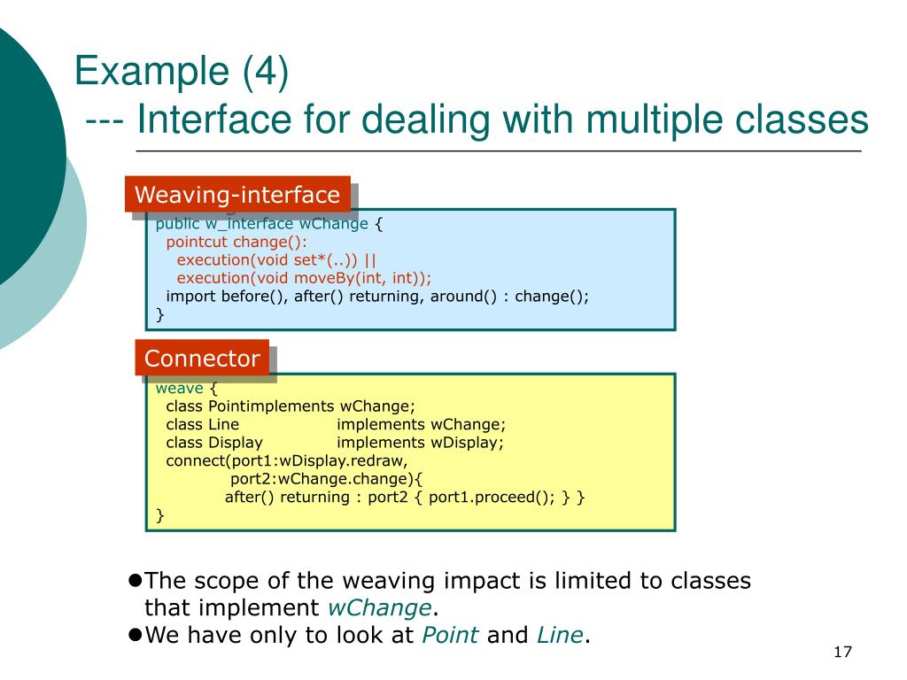 Example (4) --- Interface for dealing with multiple classes Weaving-interface public w_interface wChange { pointcut change(): execution(void set*(..)) || execution(void moveBy(int, int)); import before(), after() returning, around() : change(); } Connector weave { class Point implements wChange; class Line implements wChange; class Display implements wDisplay; connect(port1:wDisplay.redraw, port2:wChange.change){ after() returning : port2 { port1.proceed(); } } } • The scope of the weaving impact is limited to classes that implement wChange. • We have only to look at Point and Line.