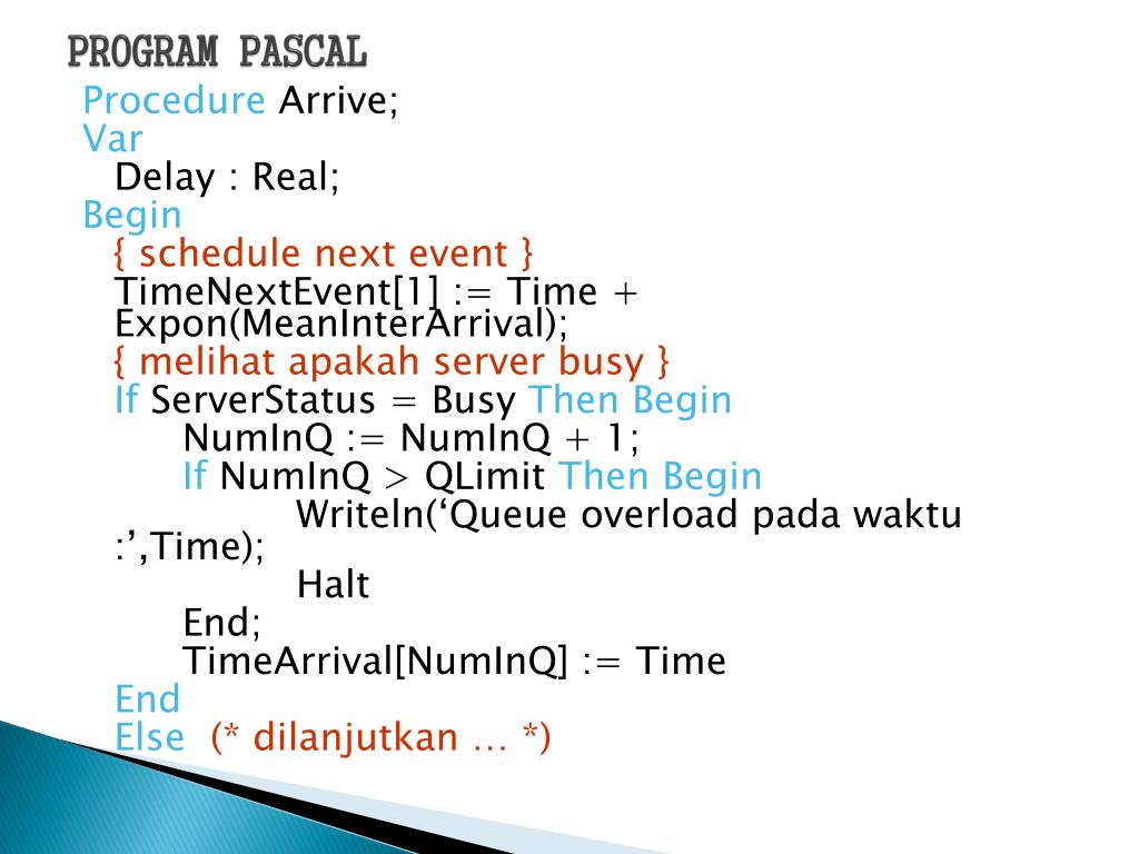 PROGRAM PASCAL Procedure Arrive; Var Delay : Real; Begin { schedule next event } TimeNextEvent[1] := Time + Expon(MeanInterArrival); { melihat apakah server busy } If ServerStatus = Busy Then Begin NumInQ := NumInQ + 1; If NumInQ > QLimit Then Begin Writeln(‘Queue overload pada waktu :’,Time); Halt End; TimeArrival[NumInQ] := Time End Else(* dilanjutkan … *)
