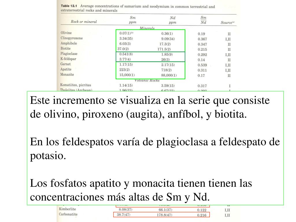 Concentraciones de Sm-Nd en rocas y minerales más importantes.