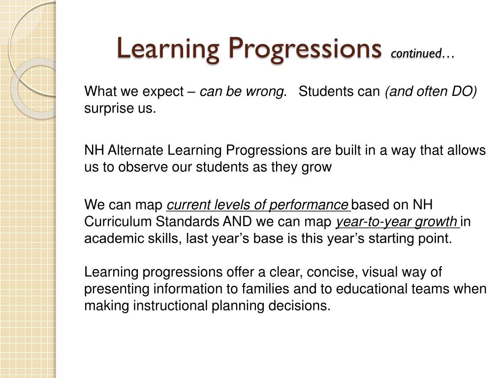 Learning Progressions continued… What we expect – can be wrong. Students can (and often DO) surprise us. NH Alternate Learning Progressions are built in a way that allows us to observe our students as they grow We can map current levels of performance based on NH Curriculum Standards AND we can map year-to-year growth in academic skills, last year’s base is this year’s starting point. Learning progressions offer a clear, concise, visual way of presenting information to families and to educational teams when making instructional planning decisions.