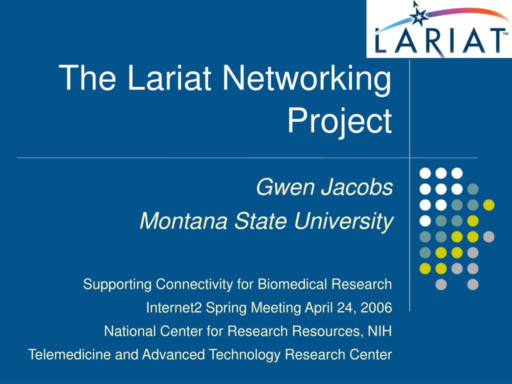 What is Lariat? • 10M project funded by National Center for Research Resources, NIH • Upgrade IT infrastructure for 6 institutions in the rural west • Connect each site to the closest Gigapop • IDeA Program: INBRE, COBRE, IDeANet