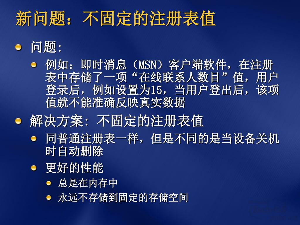 新问题:不固定的注册表值 • 问题: • 例如:即时消息(MSN)客户端软件,在注册表中存储了一项“在线联系人数目”值,用户登录后,例如设置为15,当用户登出后,该项值就不能准确反映真实数据 • 解决方案: 不固定的注册表值 • 同普通注册表一样,但是不同的是当设备关机时自动删除 • 更好的性能 • 总是在内存中 • 永远不存储到固定的存储空间